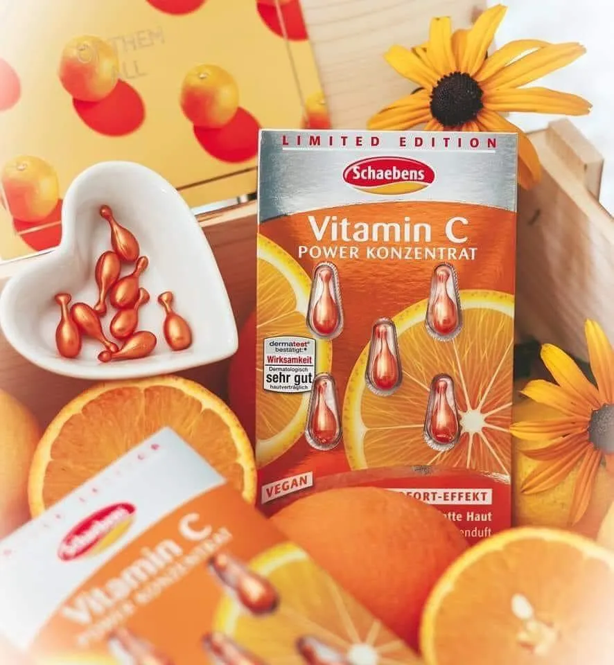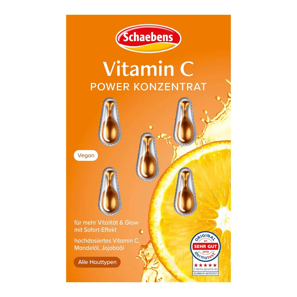 Schaebens Vitamin C Power Concentrate A fast energy boost for more power. The light texture of this concentrate absorbs quickly and leaves a pleasant feeling on the skin. The formula with valuable almond and jojoba oils leaves the skin feeling supple. Thanks to the antioxidant properties of vitamin C, the skin's appearance can become more balanced with regular use. The individual capsules allow for easy and hygienic dosing for your daily skincare routine.