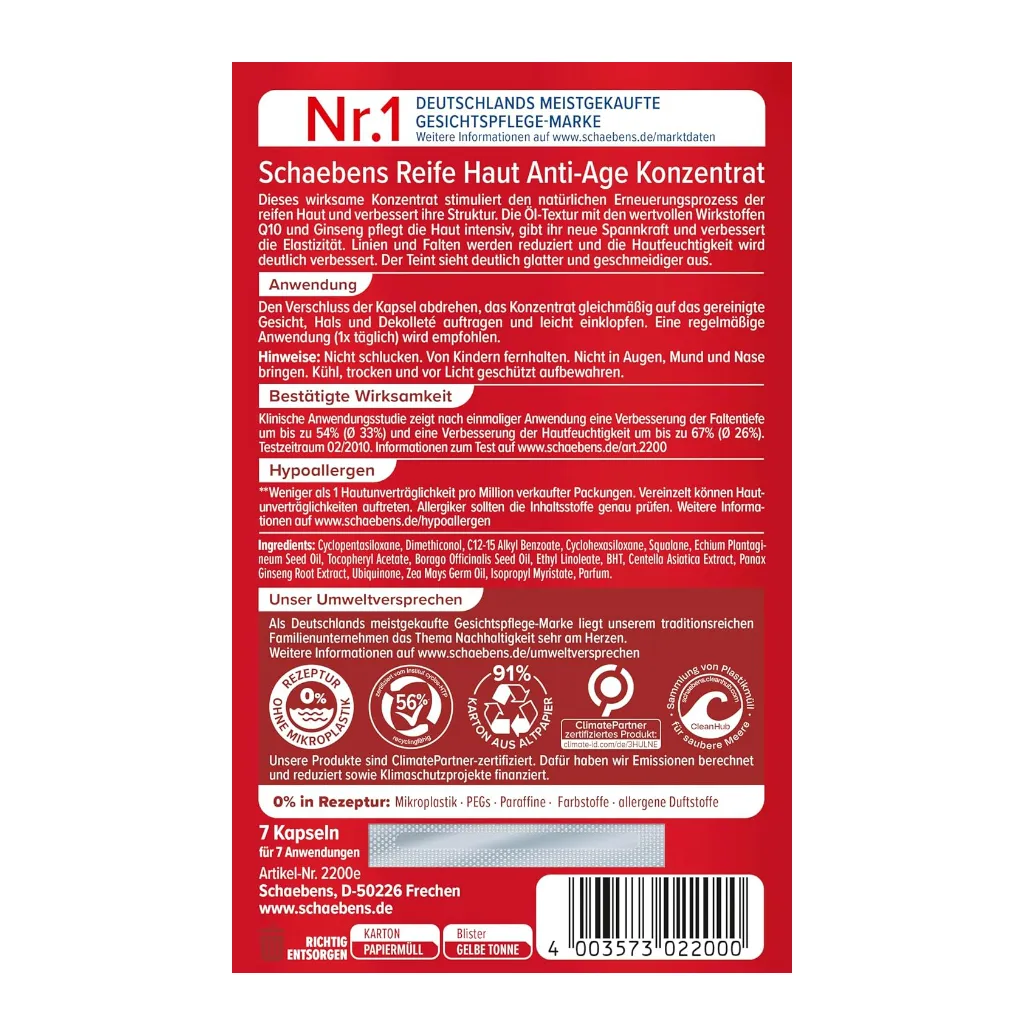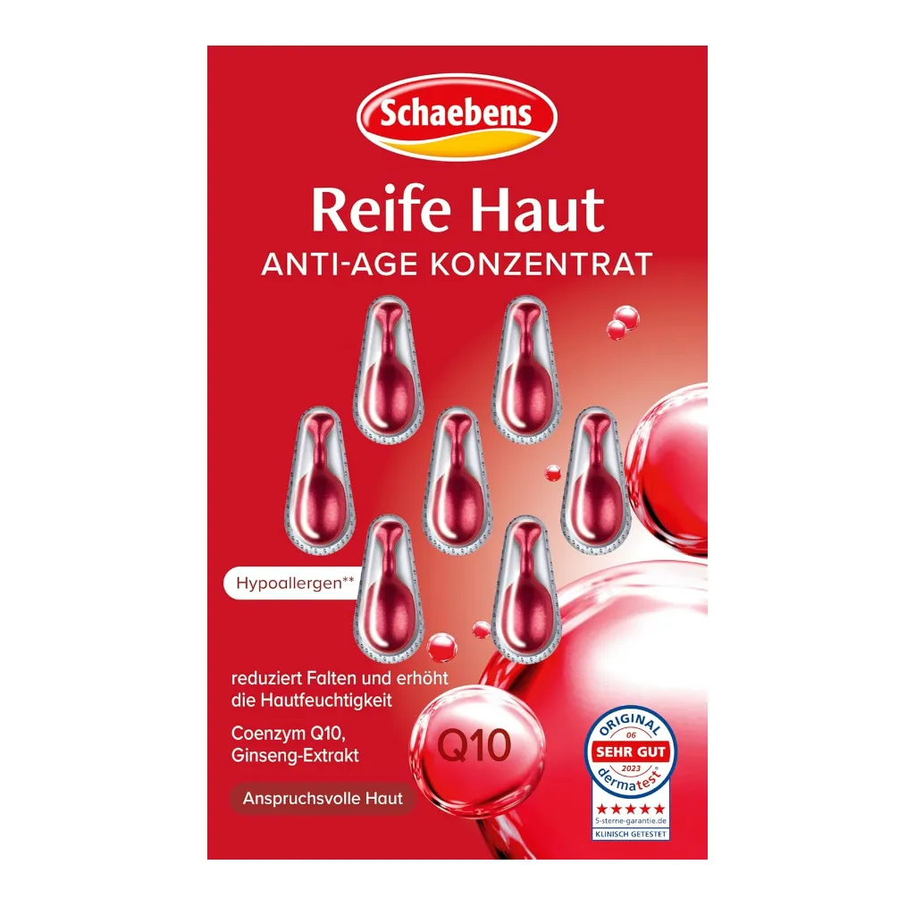 The Schaebens mature skin concentrates this effective concentrate stimulates the natural renewal process of mature skin and improves its structure. The oil-based formula, enriched with valuable active ingredients Q10 and ginseng, intensively nourishes the skin, restoring firmness and improving elasticity. Lines and wrinkles are reduced, and skin hydration is significantly enhanced. The complexion appears noticeably smoother and more supple.