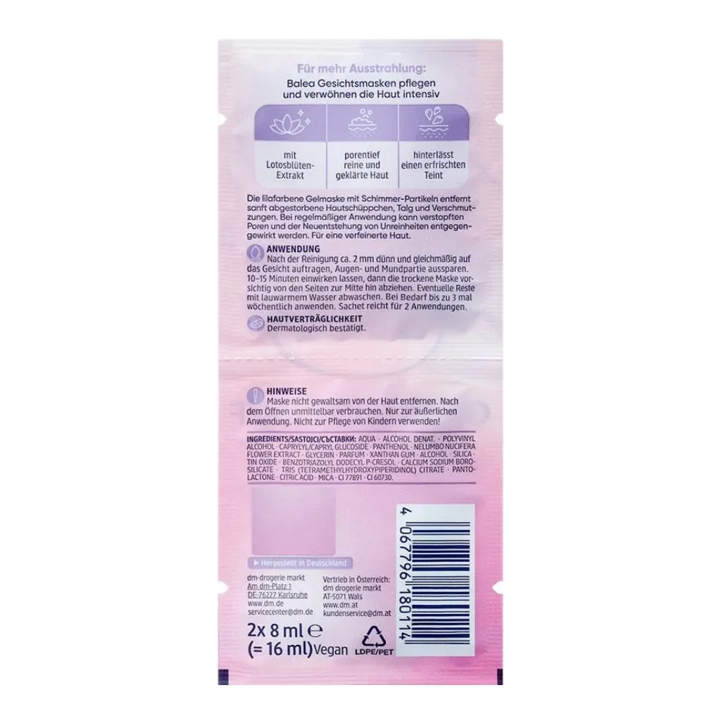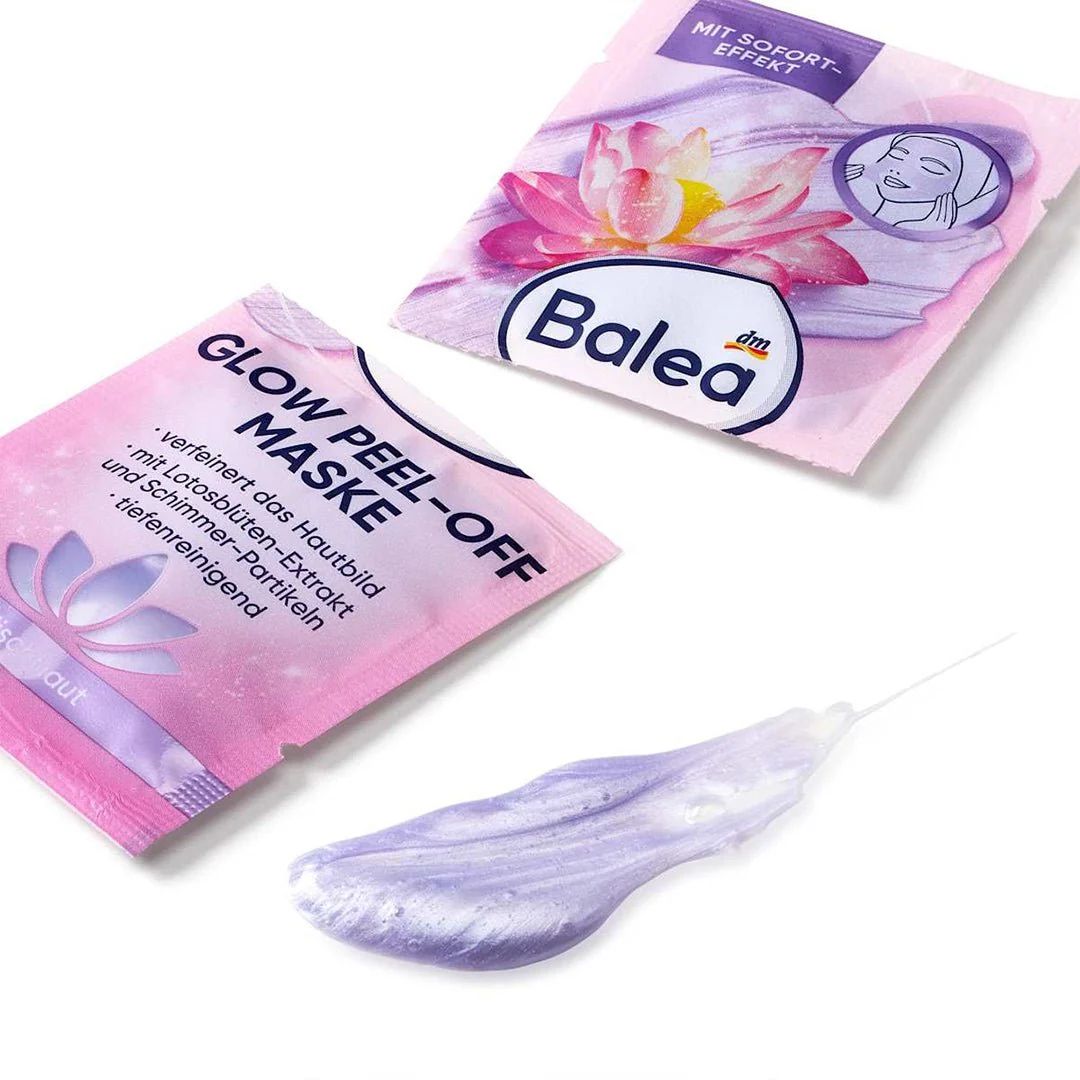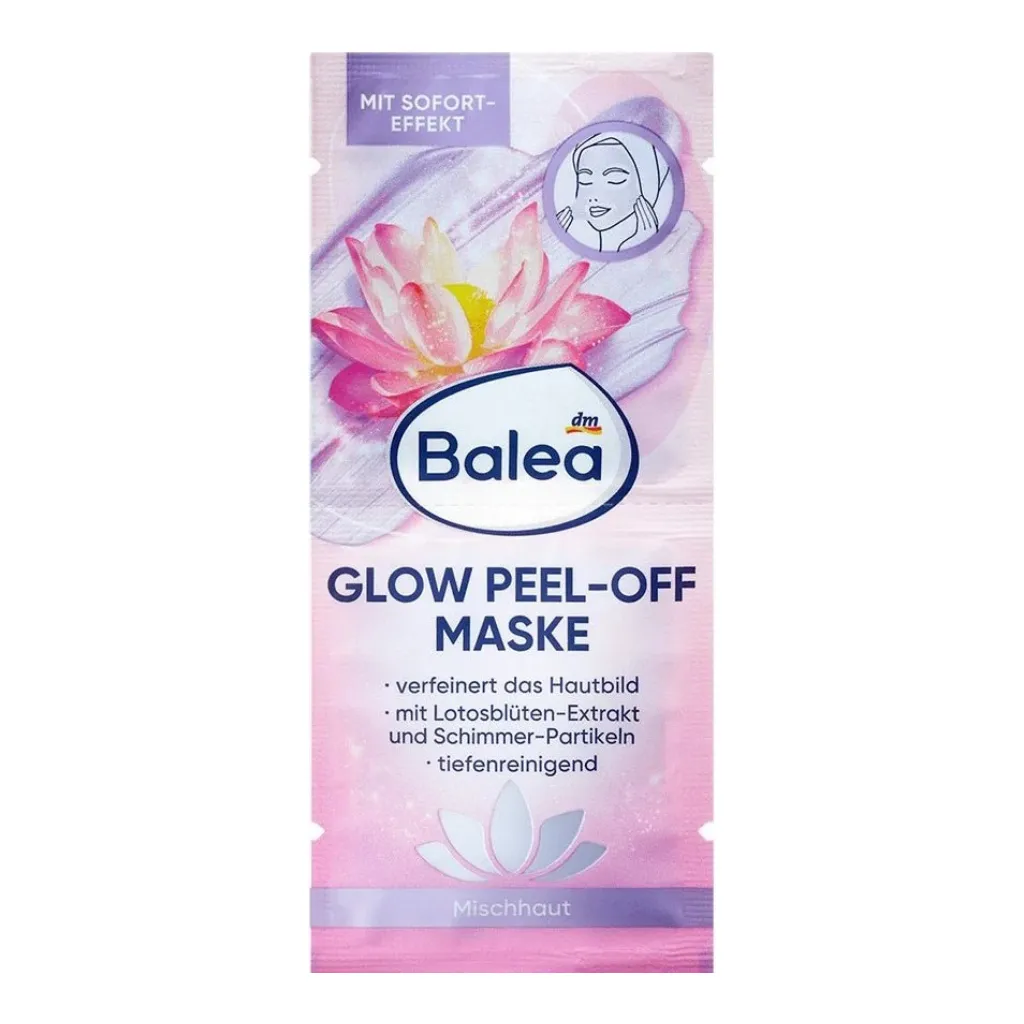 Balea's Glow Peel-Off Mask refines the skin's texture and, with lotus blossom extract and shimmer particles, ensures a radiant complexion. This deep-cleansing mask removes impurities and leaves the skin refreshed and clarified. Ideal for a pampering facial; it gives the skin a smooth, revitalized appearance. Perfect for anyone who desires intensive cleansing and a captivating glow.