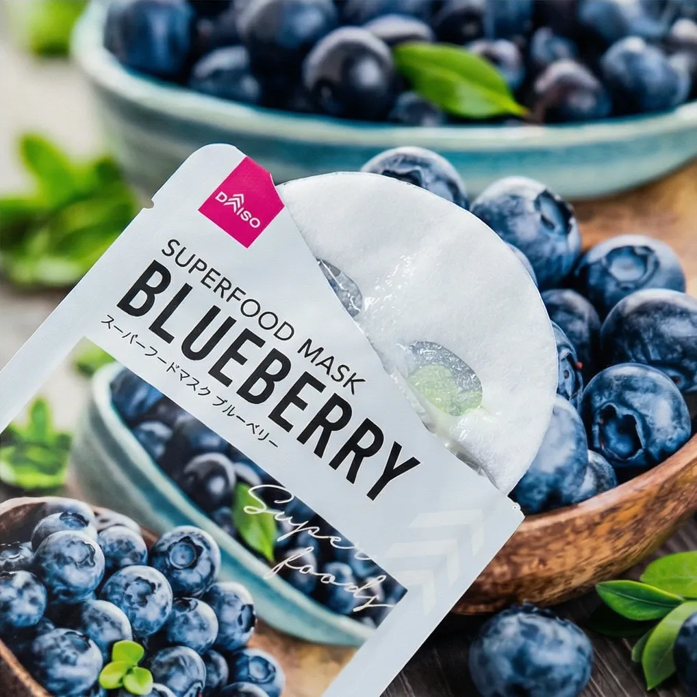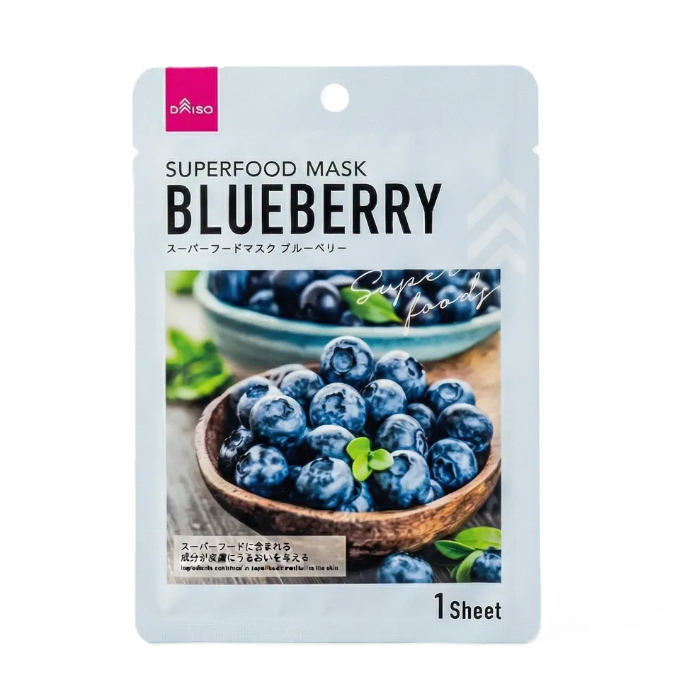 Daiso Superfood Sheet Mask Blueberry for brightening, moisturizing, shiny, energy, nutrition, whitening, etc. Blueberries, which have an antioxidant effect and superior antioxidant effect prevent ageing of the skin, improve wrinkles and protect skin Help to keep your skin active. Rich in nutrients and it's plant-based chemicals that enhance health. Nutritious superfood helps to keep beautiful skin and replenishes nutrients that are lacking on the skin. Perfect gift for birthday or for yourself. Low irritation and flexible fibber-filled with fruit extract are highly concentrated. This mask is designed with premium ingredients and specially formulated for all skin types, including sensitive skin.