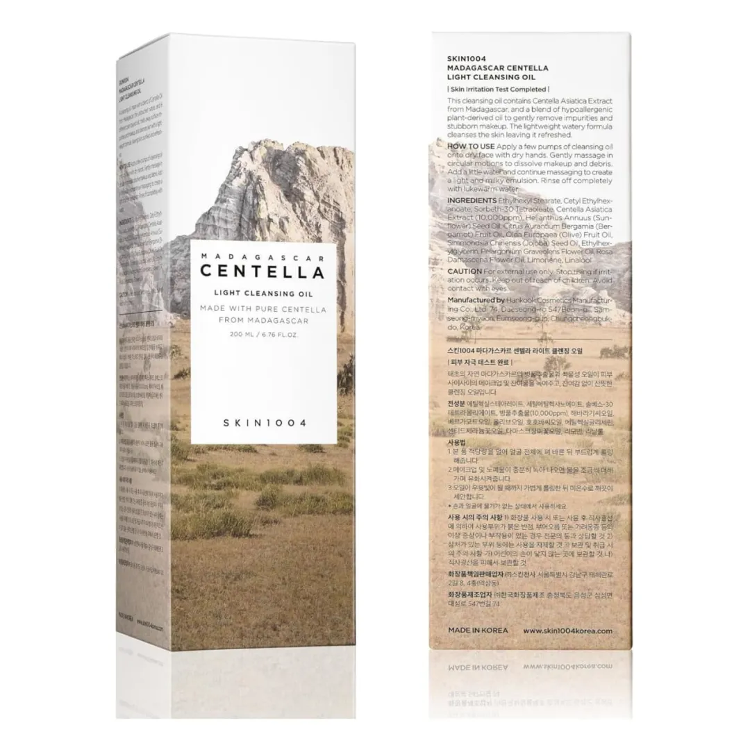 SKIN 1004 Madagascar Centella Light Cleansing Oil is a gentle, lightweight oil that deeply removes makeup, excess oil and sunscreen. Infused with soothing Centella Asiatica extract and a carefully selected blend of six botanical oils, this cleansing oil dissolves impurities without irritating skin, while purifying pores. Its lightweight texture leaves a refreshing finish on the skin, leaving it clean, smooth and perfectly prepared for the next steps in your routine. Ideal for all skin types; it offers micellar cleansing that absorbs impurities while maintaining hydration.