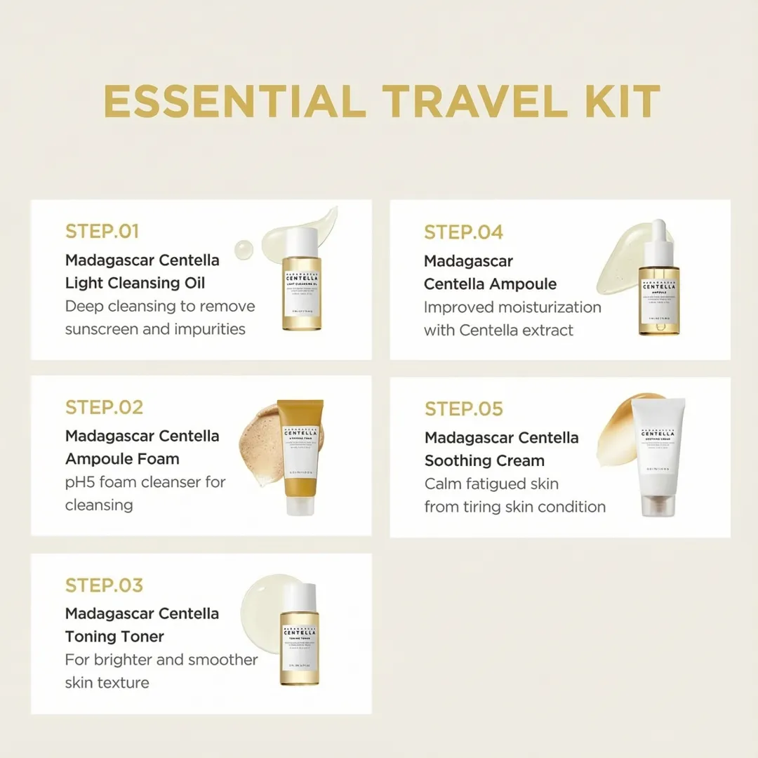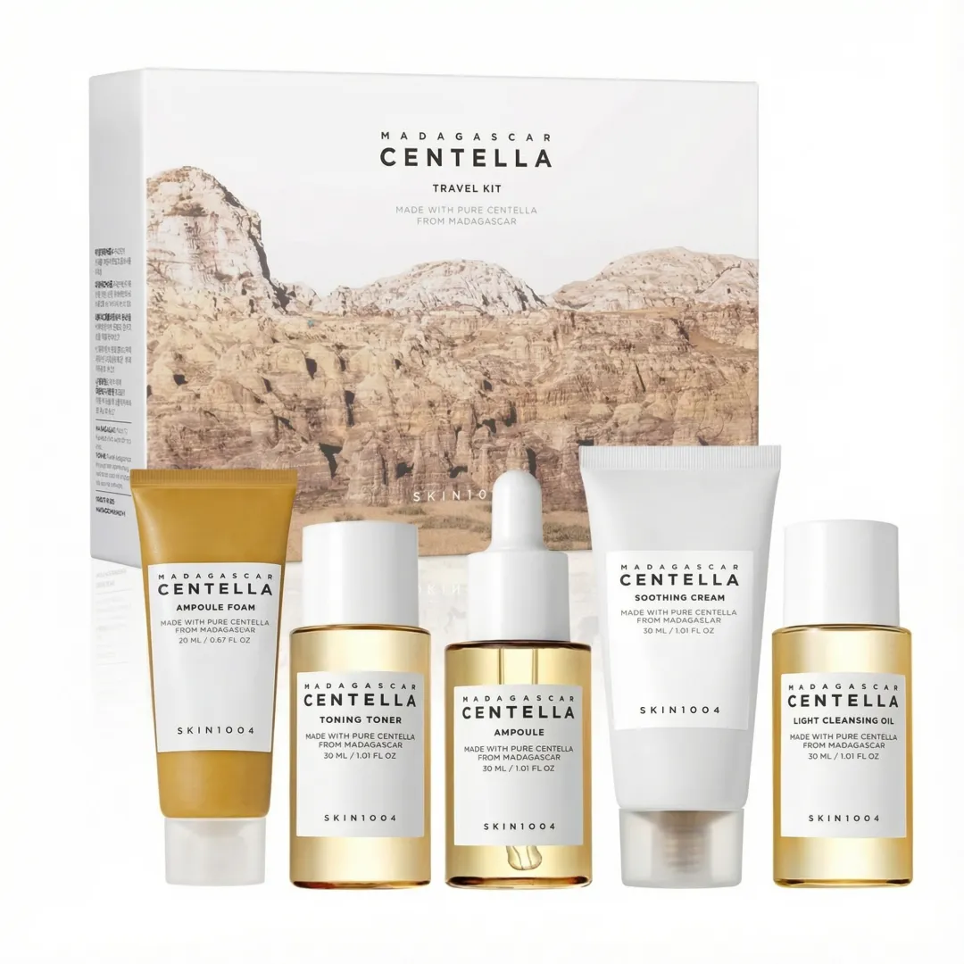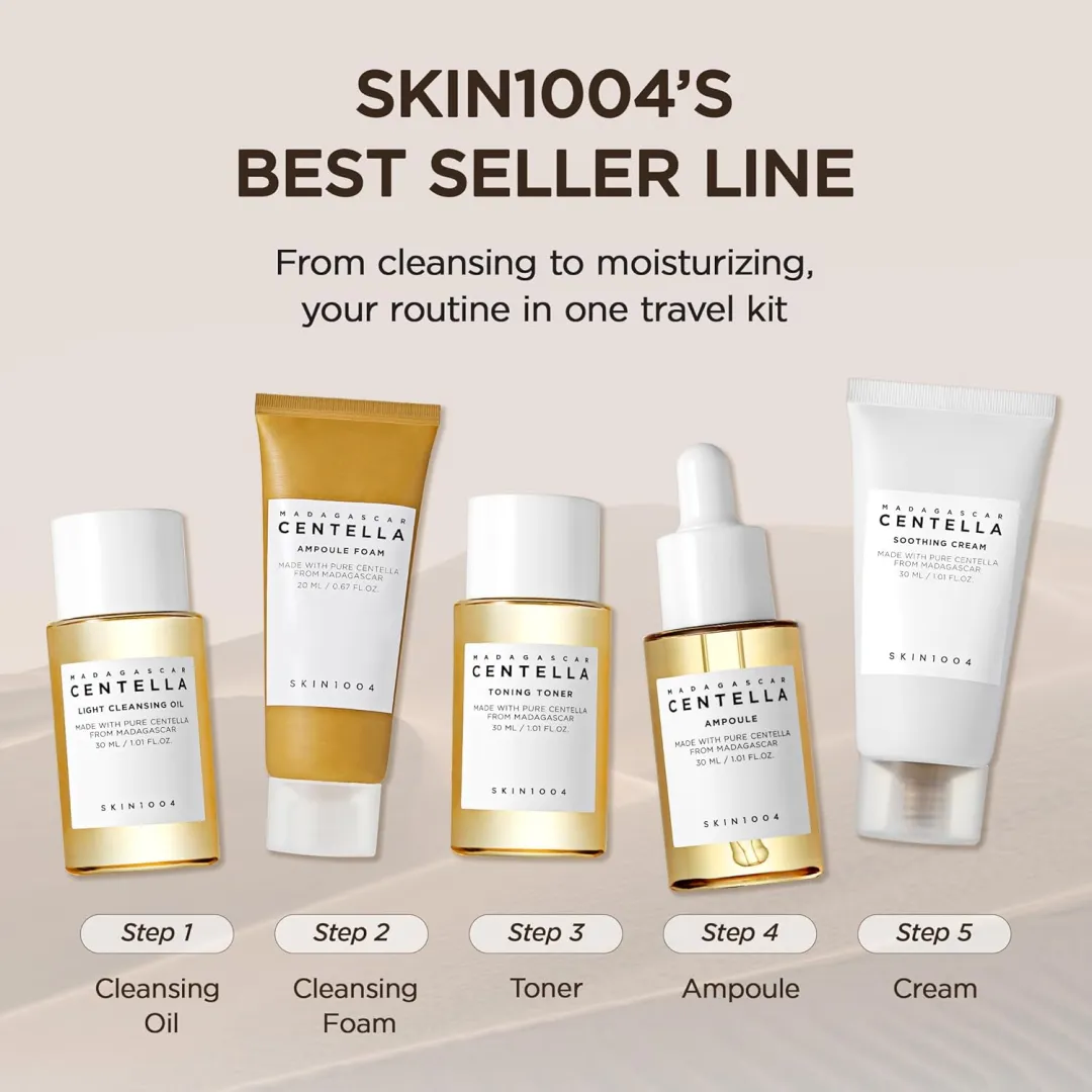 This travel kit consists of- Ampoule Foam 20ml, Toning Toner 30ml Ampoule 30ml, Soothing Cream 30ml, Light Cleansing Oil 30ml. SKIN1004 Madagascar Centella Travel Kit, Basic Skincare Box Soothing Calming Compact Size. Ampoule Foam: A deep cleanser helps remove pore waste and balances skin. Toning Toner: A multi-tasking toner replenishes hydration after cleansing while removing dead skin cells gently. Ampoule: Contains 100% Centella Asiatica Extract to help create an intact skin barrier. Soothing Cream: A moisturizer formulated with EWG certified Green Grade ingredients only. Light Cleansing Oil - A lightweight cleanser removes all makeup and sunscreen completely.