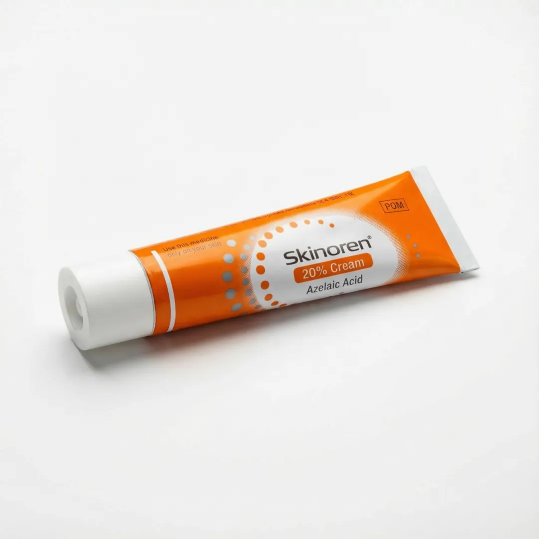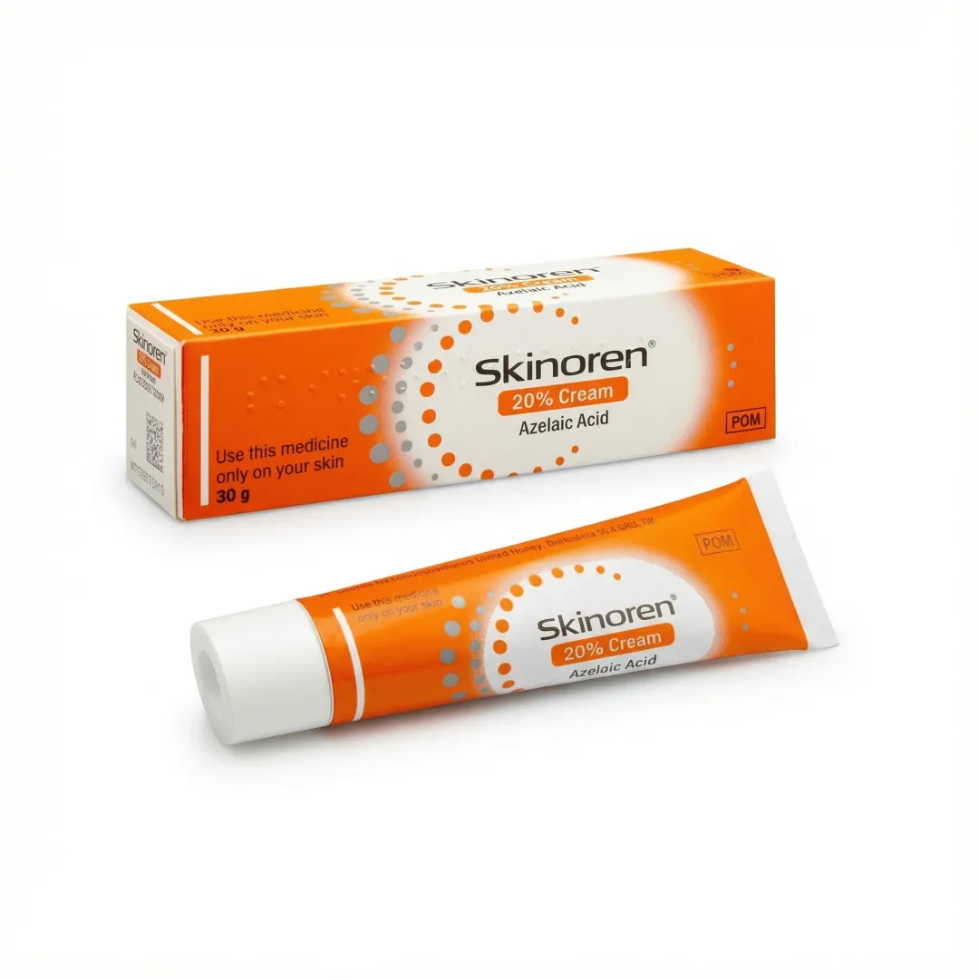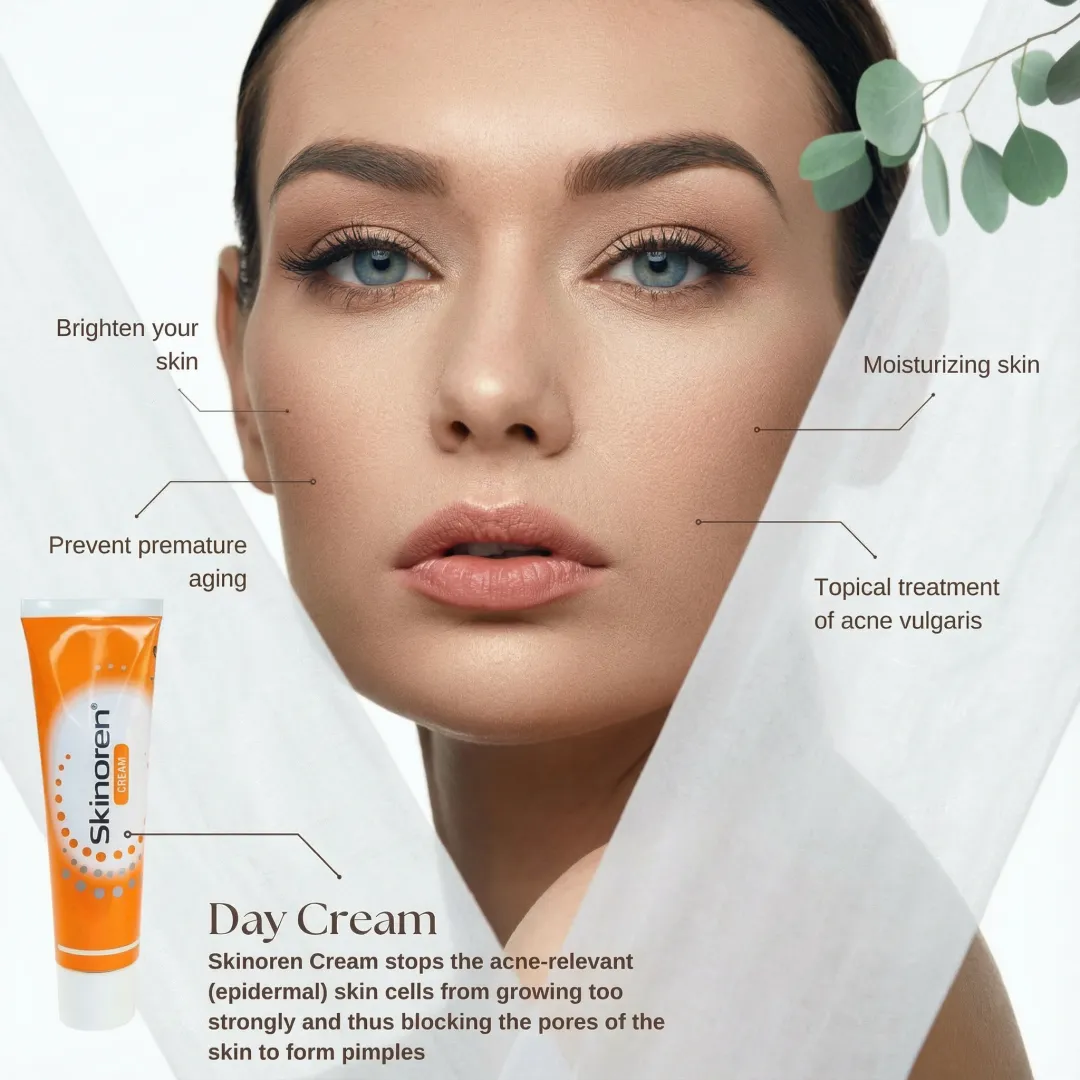 Skinoren Cream is a topical treatment for acne vulgaris that contains 200 mg of azelaic acid per gram. Azelaic acid works through a dual mechanism: it reduces the growth of keratin cells that block pores and sebaceous glands, and it has antibacterial properties that help kill the bacteria responsible for acne. Skinoren is alcohol-free and is typically used for treating mild to moderate acne, including cystic acne. It helps to clear up acne lesions and prevent new ones from forming. The cream is applied directly to the affected areas and is suitable for daily use, offering an effective treatment option with minimal irritation for most skin types. Skinoren cream should be rubbed into the affected areas twice daily, after washing.