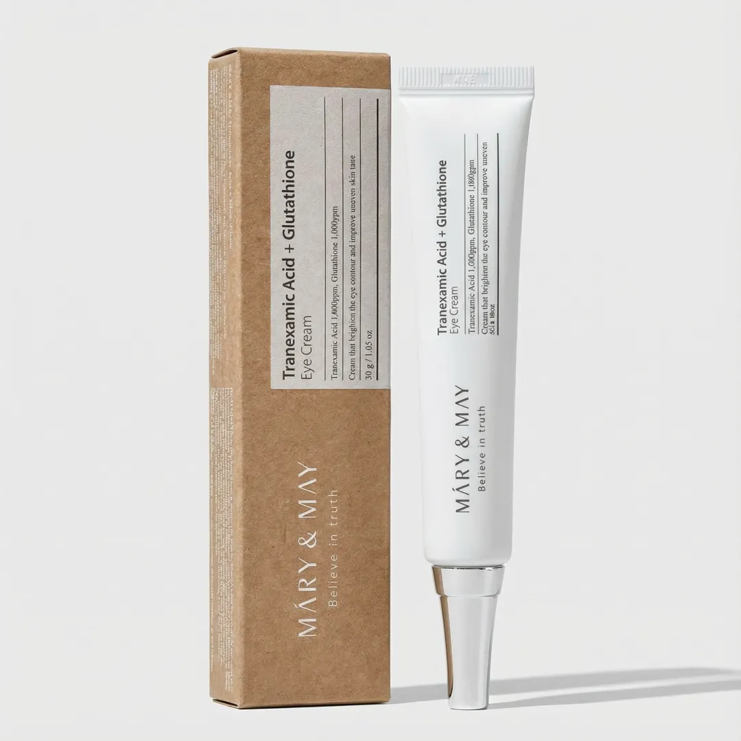 Mary & May Tranexamic Acid + Glutathione Eye Cream, a targeted solution for dark circles, fine lines, and wrinkles. Clinically proven to improve skin texture, dark circles, and fine lines within just two weeks, this eye cream combines the brightening power of Tranexamic Acid which inhibits melanin production and reduces pigmentation with Glutathione, Niacinamide, and Vitamin C to deliver a luminous, even-toned look.