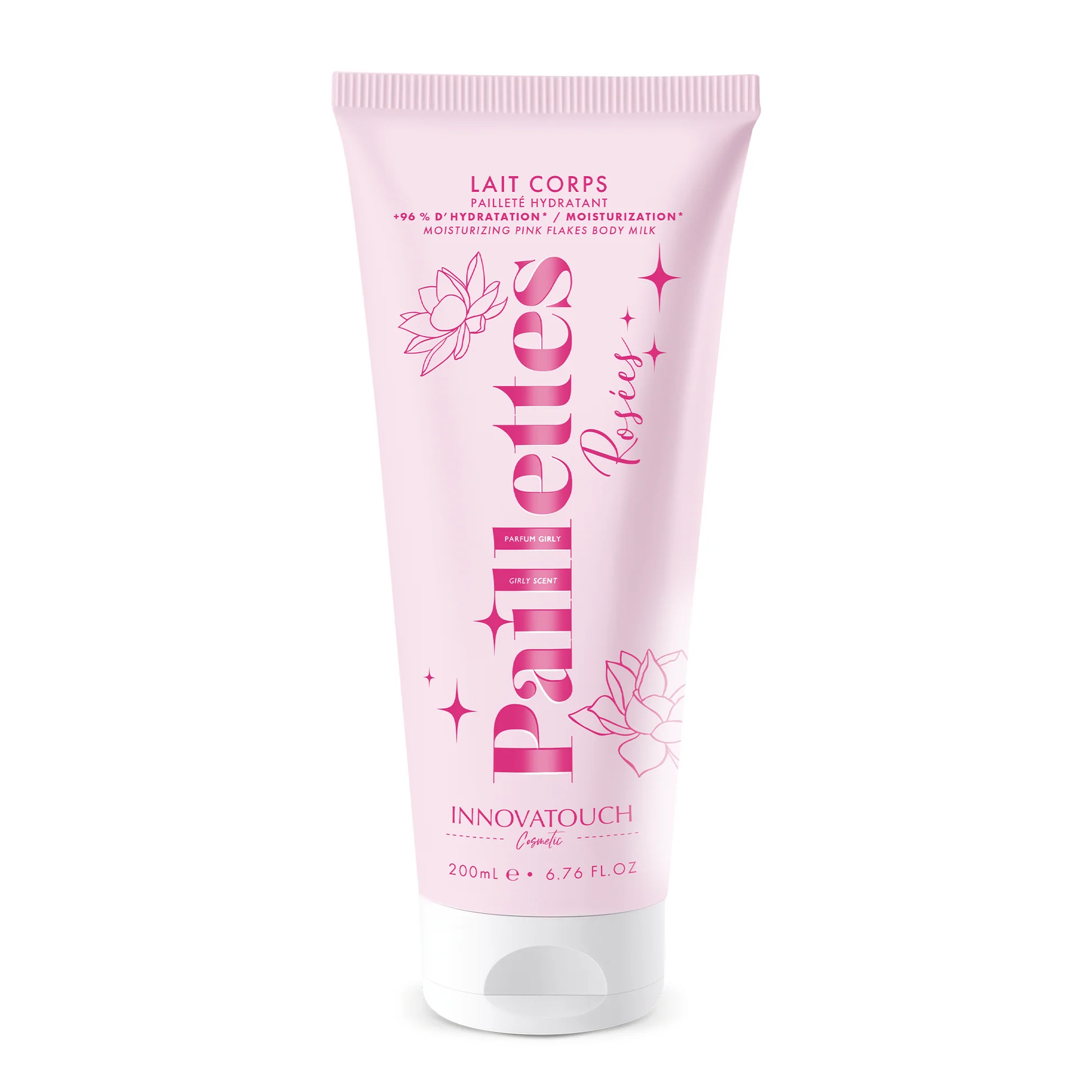 Innovatouch Cosmetic's Girly Glittery Pink Body Lotion moisturizes the skin while giving it a delicate, luminous glow. Its light texture deposits fine pink glitter that forms a subtle veil on the skin, offering an elegant and naturally radiant finish. With a formula that provides up to 96% hydration*, this body lotion keeps skin soft and comfortable all day long. Its texture melts into the skin and helps maintain optimal hydration levels for more supple and velvety skin. Its soft and modern Girly fragrance delicately envelops the skin. The pink glitter captures the light and enhances the entire body, perfect for adding a touch of sparkle to everyday life or for a special occasion. Its creamy formula is quickly absorbed without leaving a greasy residue. The skin is soft, luminous, and adorned with an iridescent pink veil for a refined and discreet effect.