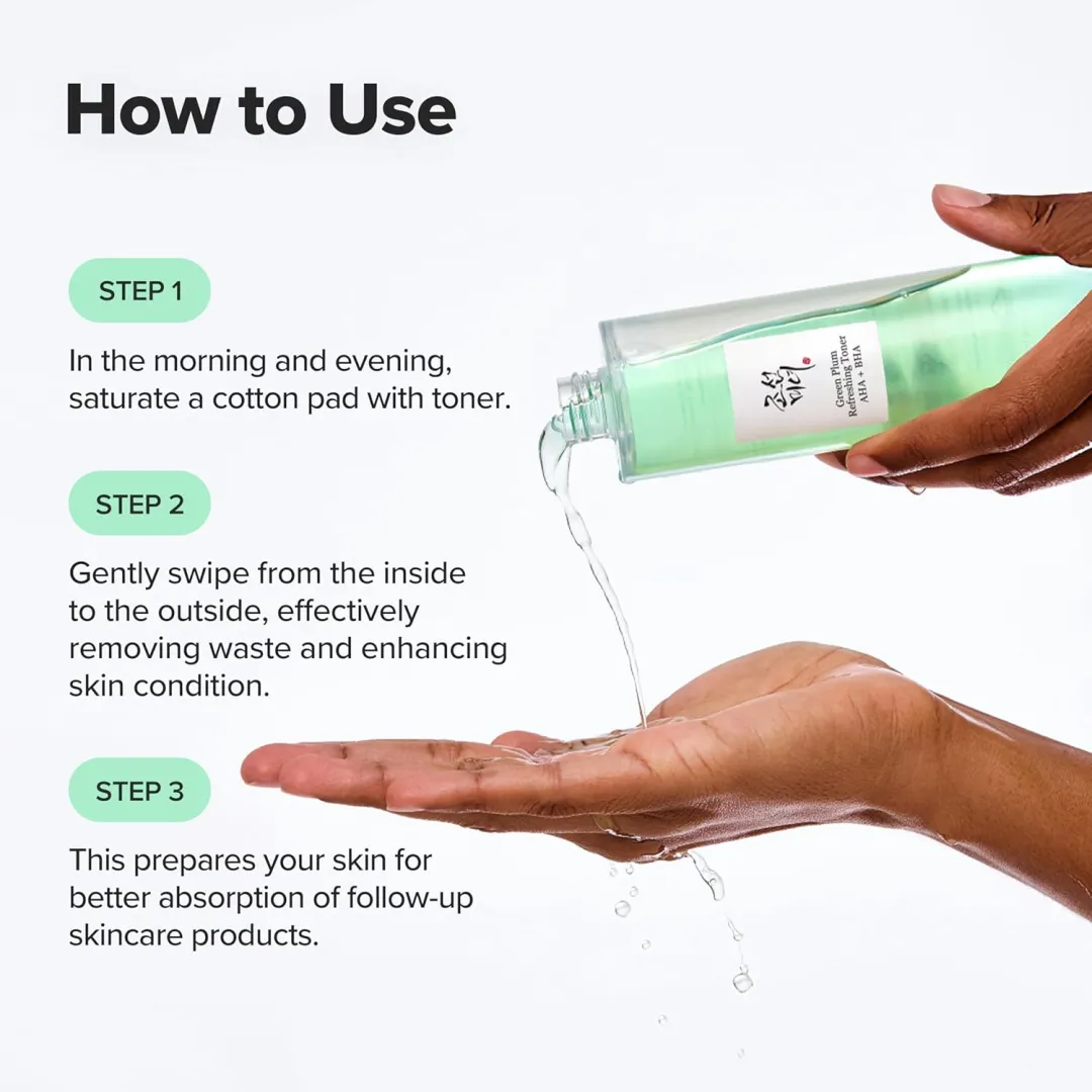 A refreshing facial toner with green plum and AHA+BHA acids. Our skin's natural rhythm includes a 28-day cycle of cell renewal and exfoliation. If this process is hindered by dead skin cells clogging our pores, it can lead to inflammation and a dull complexion. We've formulated a gentle, lightweight toner to help remove any remaining dead skin cells and oil that may linger after cleansing. At the heart of this toner lies the power of peach, a time-honored herbal remedy now being harnessed for its beauty benefits in refining skin texture and removing dead cells. Working in harmony with mung bean extract—a skin-soothing powerhouse—and the chemical exfoliants AHA and BHA, this toner is formulated to revitalize your skin's natural glow. This daily exfoliating toner, Green Plum Toner, is ideal for using morning and evening as the first step in your skincare routine to remove remaining oil and smooth skin texture. After adequately saturating a cotton pad with the toner, gently wipe over the skin from the inside out. It not only cleanses the skin, but it also improves the skin condition to facilitate better absorption of skincare products.