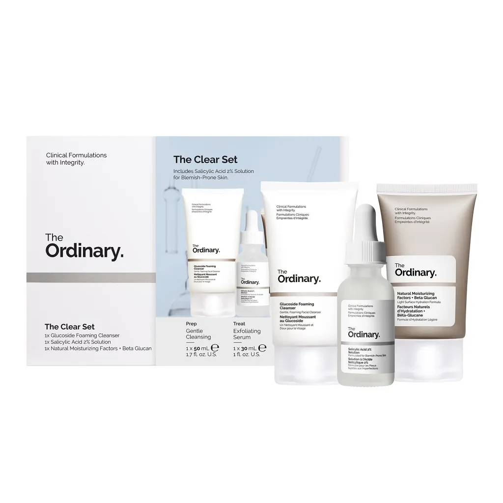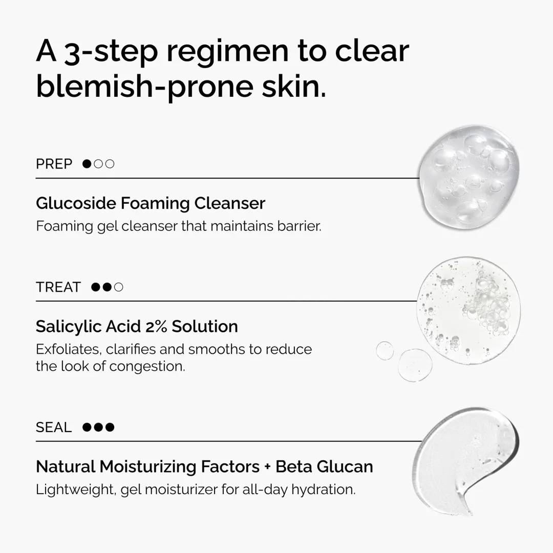 The Clear Set is a targeted skincare regimen ideal for blemish-prone skin. It includes the Glucoside Foaming Cleanser, a gentle, gel-like cleanser that removes impurities while improving skin clarity and texture. The set also features the Salicylic Acid 2% Solution, a water-based serum that exfoliates and unclogs pores, promoting clearer skin. Finally, the Natural Moisturizing Factors + Beta Glucan gel moisturizer provides all-day hydration and strengthens the skin barrier, making it perfect for maintaining healthy, supple skin.