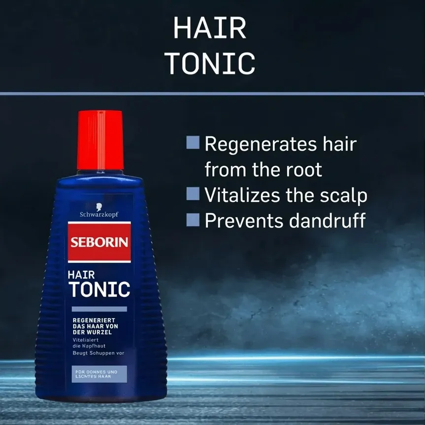 Schwarzkopf SEBORIN Hair Tonic regenerates hair from root to tip: The provitamin B5 contains penetrates the hair shaft and repairs damaged hair from within. Ginger root extract further enhances blood circulation in the scalp and revitalizes the hair roots – a revitalized scalp is the foundation for healthy-looking hair. Seborin Hair Tonic also helps prevent dandruff.